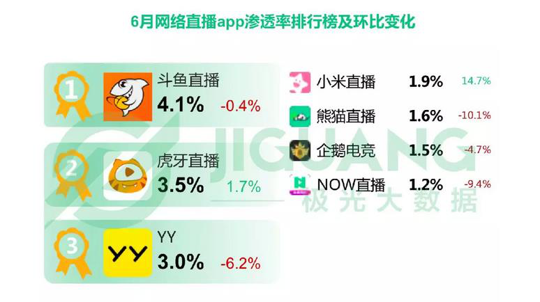 同时在网络直播APP渗透率排行榜上,斗鱼以4.1稳居榜首,高出第三名1.1个百分点,第二名0.6个百分点,稳坐游戏直播平台第一的位置。