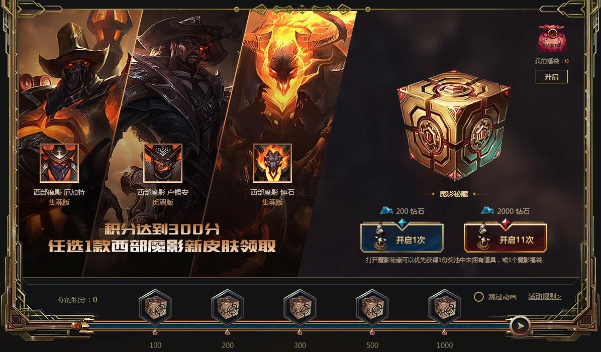 《英雄联盟》西部魔影2018系列皮肤霸气登场!除了直接购买,还可通过魔影密藏活动获得。消耗钻石购买指定道具,即可获得翻卡机会,可以获得魔影秘藏或福袋。累计获得的积分达到300分,可在活动页面任选一款西部魔影新皮肤领取。
