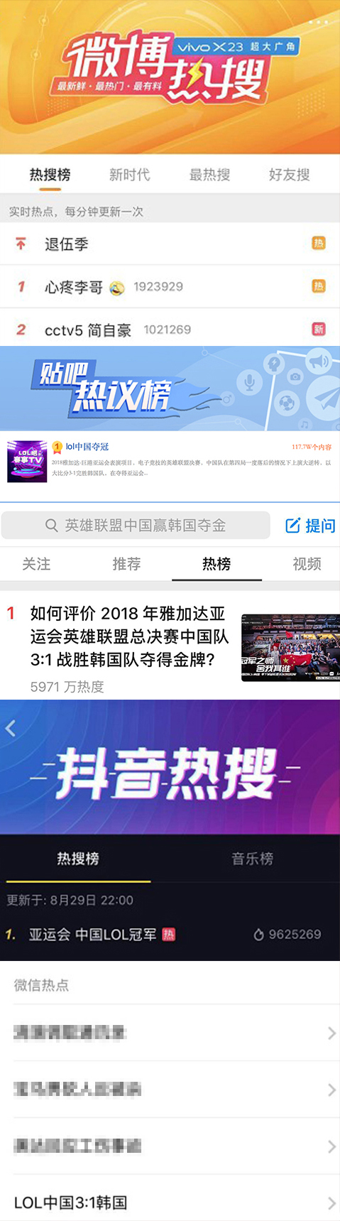 除了媒体报道外,比赛结束后,英雄联盟夺冠登上了微博、知乎、贴吧、抖音所有平台的热搜榜第1名,微博热搜前10占3,夺冠事件成为了微信搜一搜的热点事件。