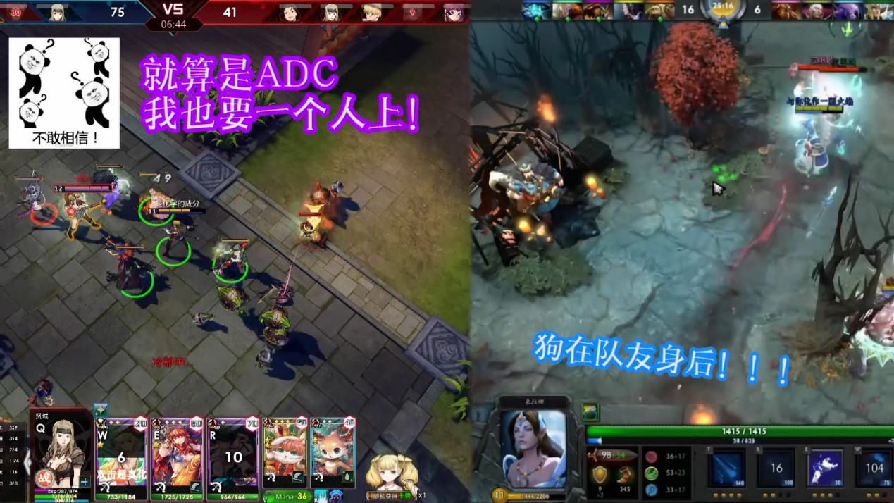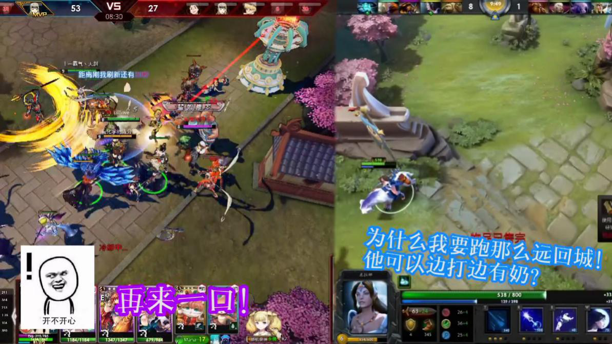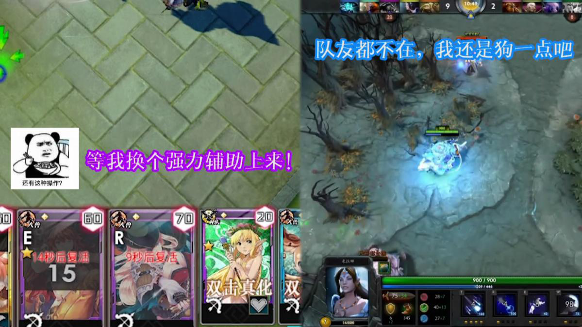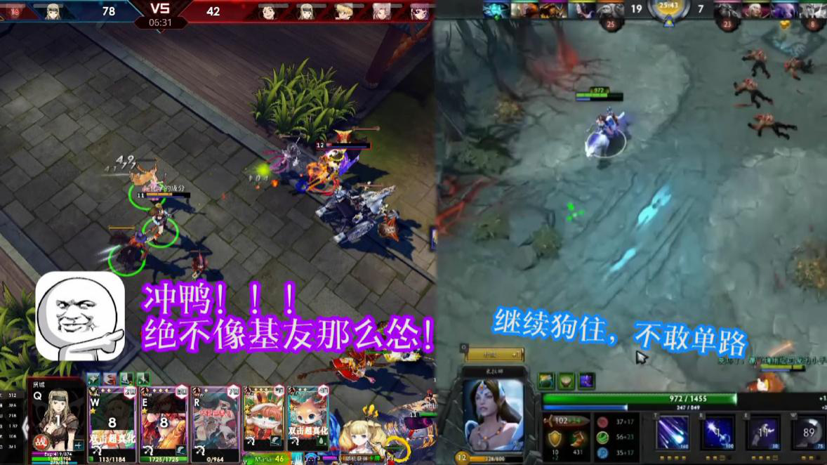 而传统MOBA游戏这边,该玩家还坚定不移的苟着,不过这次终于有了进步,队友没在离开身边,于是很幸福的跟在其身后,但面对不断变化的战场局势,这位玩家始终没能离开队友,想要一个人去打单路?那是传统MOBA游戏不存在的概念!