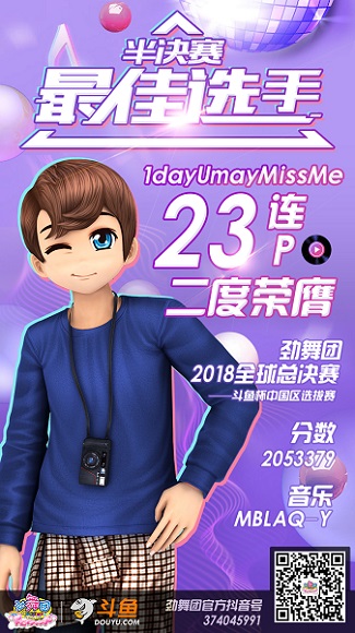在全国赛半决赛中,id为“1dayUmayMissMe”的选手在小组赛bo5的第一局中,分数破百万,名列第一。而在第二局中,他虽名次稍有落后,却仍有23连p的超凡操作,引爆全场,并以两百万分的高分,在众人的惊叹声中跳完了《Y》这首歌曲。后三局他凭借自己稳定的临场发挥,成功地取得了参加决赛的资格。“1dayUmayMissMe”在半决赛中拔萃的表现为人称赞,成为《劲舞团》全国赛半决赛的最佳选手!