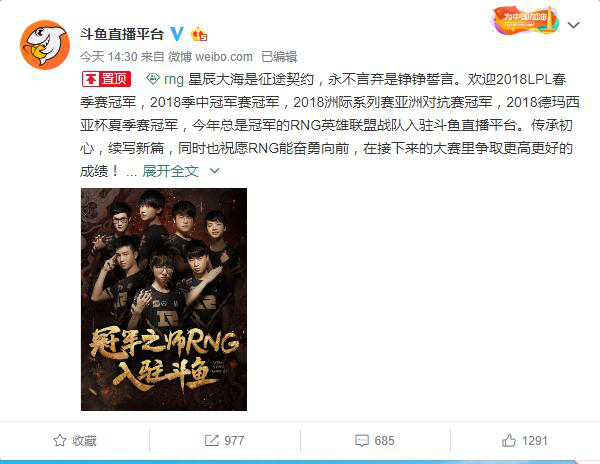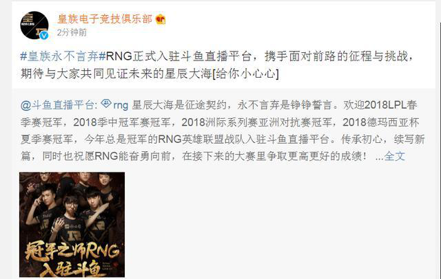 9月4号,斗鱼官方微博发布了RNG入驻的消息,同时皇族电子竞技俱乐部官方微博也在第一时间进行了转发,这标志着RNG正式入驻斗鱼直播平台。