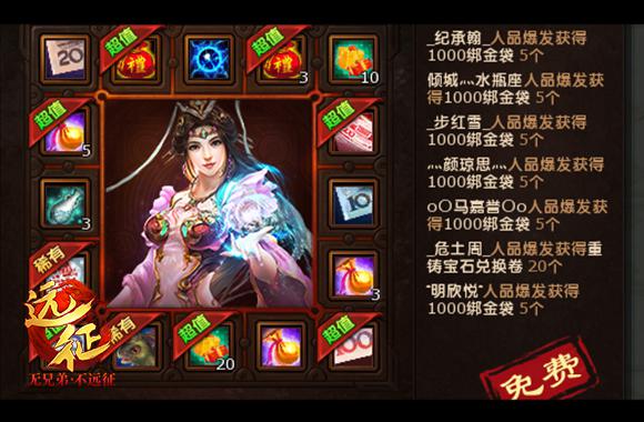 开服老规矩再续,经典福利继续放送,拯救你的新号“傻白甜”,秒升级、秒变精英战神!新区冲级送坐骑、金币、绑金;限时稀有道具抽奖可得;每日登陆并分享送绑金;新手现金福利;充值加送金币;拼手气得永久神装!一切福利尽在《远征》新区【番天】,今日13:00正式来袭,等你来战!