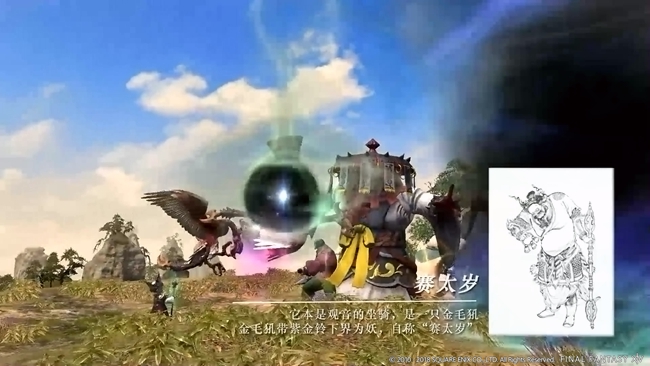 在FF14中的风水灵庙岩燕庙中,有个BOSS就是大家熟悉的“赛太岁”。在中国名著《西游记》中,赛太岁本是观音菩萨的坐骑金毛犼,它的项上饰物是紫金铃,金毛犼带紫金铃下界为妖,自称“赛太岁”。