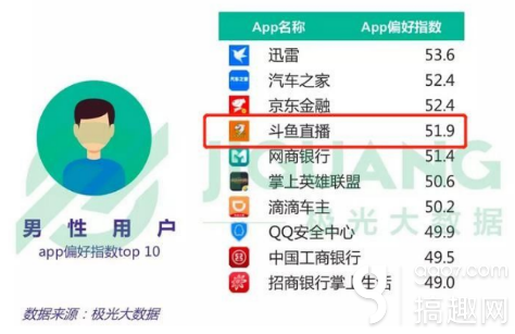 中国领先的移动大数据服务商极光大数据发布了《2018年Q2移动互联网行业数据研究报告》,斗鱼表现抢眼,不仅在男性用户APP偏好指数TOP10榜单中以唯一的直播APP身份名列第四,也在市场数据方面名列前茅。在直播领域当中,斗鱼直播以6月渗透率4.1%、DAU均值761.6万排名第一。