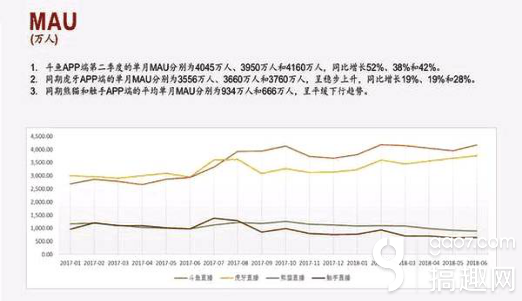 QuestMobile发布的报告显示,斗鱼APP在今年第二季度的MAU分别达到了4045万、3950万和4160万,同比增长52%、38%和42%。数据反映了斗鱼的实力,也表明了斗鱼获得了各大业内专业人士的认可。