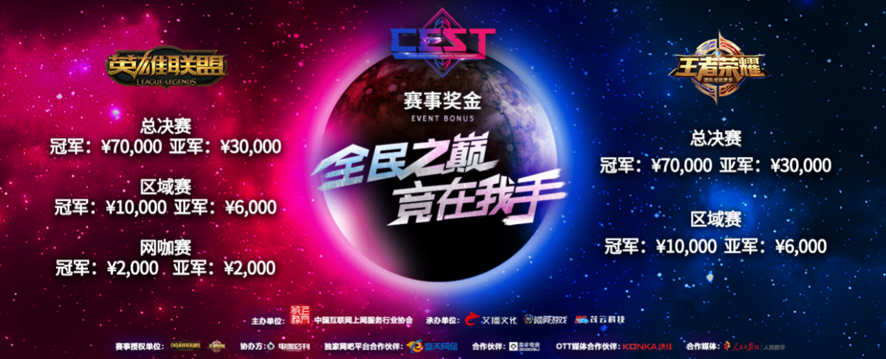 据了解,此次CEST将包含4大赛区,覆盖全国20省150市,12000家电竞馆&网咖。其中传统电竞赛道将设《英雄联盟》、《王者荣耀》两个比赛项目,两个项目总奖金超过55万元人民币,在线上赛事的基础上,大赛还将结合自身特色加入“电竞馆”赛道,鼓励更多地区、更多上网场所和队伍参赛。目前,赛事报名已全面展开,《王者荣耀》的参赛者可以通过中国互联网上网服务行业协会官方公众号,CEST大赛官方公众号,或大赛官网www.chinacest.cn提交报名材料,《英雄联盟》的参赛者除了可以通过公众号及官网报名外,亦可通过本届CEST的合作电竞馆(网咖)线下递交相关的报名材料。