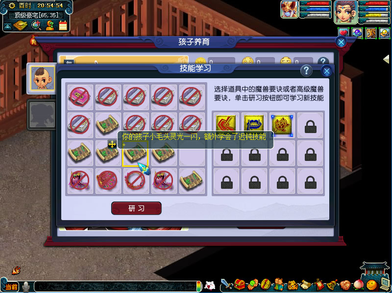 孩子养育到一岁后,可以将孩子带到门派师傅处进行拜师,拜师后完成门派师傅交予的任务,也将锻炼孩子,提升孩子的对应养育属性。此外,玩家在孩子6岁前,均可以给孩子还魂秘术、黄帝内经、蚩尤武诀等特殊技能书,待孩子6岁获得结局后,将会获得相应的特殊技能。孩子养育结局后,可能随机获得0到2个召唤兽技能。研习技能时,学习到的新技能有可能会覆盖已学会的技能,也有一定概率开启新的技能格,通过研习技能最多获得5个召唤兽技能。