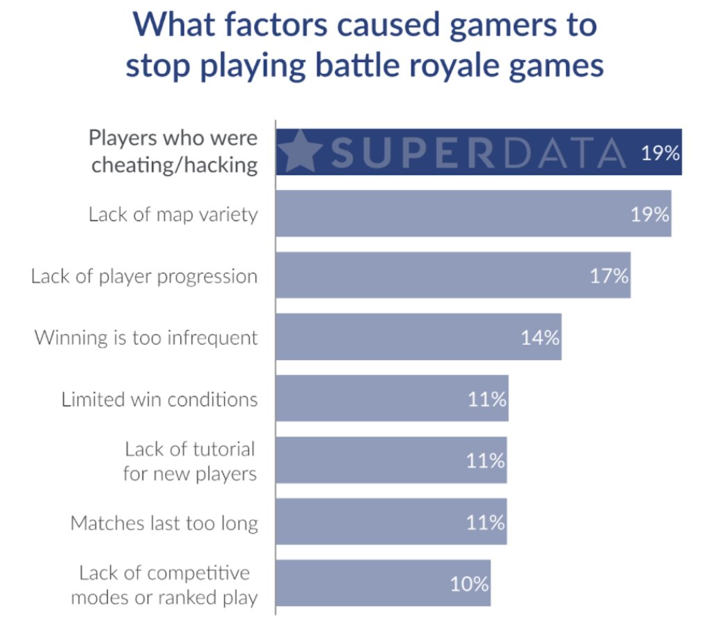 国外权威数据机构Superdata日前分享了一组数据统计,为大家揭晓了玩家脱坑“大逃杀”游戏的原因,从列表的来看,玩家脱坑“大逃杀”的主要原因是外挂和地图的匮乏,其中因为外挂脱坑的玩家约占19%。