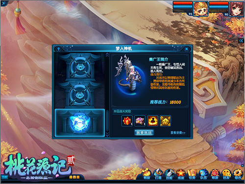 随着周年庆的开启,《桃花源记2》全新挑战玩法梦入神机将于今日全服上线,一人一生仅可挑战一次的终极之战,十殿阎罗的究极考验,你会顺利通过吗?成功通关的少侠不仅可以获得超强的属性称号,更有精灵之心、高级兽决等极品好礼,小伙伴们赶快前去挑战吧!