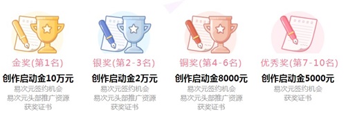 丰厚的奖励是易次元制作大赛吸引众多关注的一大亮点。一方面,大赛给前十名提供5千到最高10万的启动金奖励,另一方面,易次元给予优秀获奖者签约机会,并且为其量身打造后续的作者扶持计划,不仅在物质激励上,更在个人发展上给优秀的作者全方位的成长扶持。