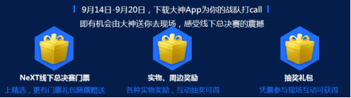 9月14日-9月20日,登录网易大神APP发布动态,带上话题?#大神送我去现场#?及?#网易电竞NeXT#,为你最爱的队伍与队员加油打气,也可以为你最爱的游戏打call,即可参与抽奖!
