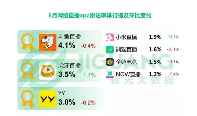 中国领先的移动大数据服务商极光大数据发布的《2018年Q2移动互联网行业数据研究报告》中,斗鱼在男性用户APP偏好指数TOP10榜单中以唯一的直播APP身份名列第四。在直播领域当中,斗鱼直播以6月渗透率4.1%、DAU均值761.6万排名第一。