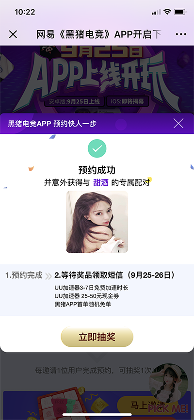 9月22日23:59前完成预约的用户,100%领取预约礼包,包括UU加速时长卡,价值25-50元加速现金卷、黑猪首单随机免单等多重好礼。同时还将根据用户喜好,推荐匹配游戏女神,能“撩”,会“玩”,懂“你”的妹子应有尽有,让游戏更有期待!