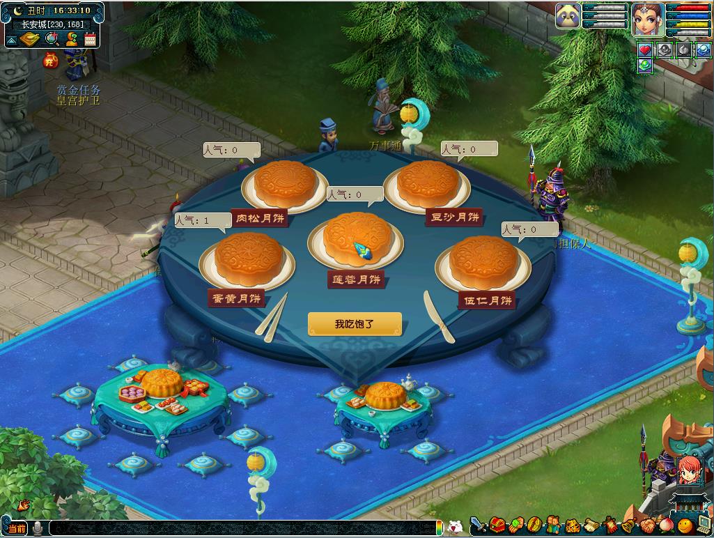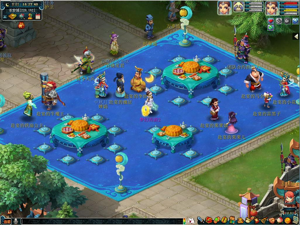 时值中秋佳节,长安城(220,165)附近摆开了一场华美的中秋月宴。中秋节活动期间全天,玩家(≥50级,单人)可在长安城(220,165)婵娟处领取任务,邀请宾客前来月宴相聚,共享团圆时刻。完成任务后可获得丰厚的经验、金钱、物品奖励,还可以额外获得较多中秋节活动积分奖励。中秋节活动积分可以在长安城(230,120)嫦娥处兑换月饼和月宴券。凭借月宴券,可以前往月宴现场品尝月饼,获得奖励!