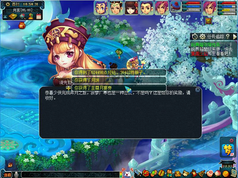 纵令奔月成仙去,且作行云入梦来。活动期间,玩家可组队找西梁女国(132,26)的流光玉兔领取任务,跟随20位流光仙子的脚步探寻月光的秘密,寻觅当年嫦娥仙子的奔月之旅。完成任务后可获得丰厚的经验、金钱、物品奖励。每天完成2轮奔月后,可以额外获得一枚梦幻月饼!