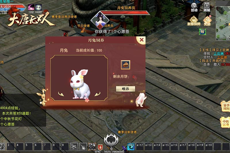 传说中月兔是月宫仙子嫦娥所饲养的仙宠,而在这中秋佳节的无双世界中,玩家们也将有机会饲养月兔。在节日期间的长寿宫、冰风洞、恶人谷、夜哭山庄、五灵坛、饮魂窟、试炼场副本中将会掉落“月饼块”,这些月饼块就是喂养月兔的仙宠口粮,每一次喂食都将增加月兔的成长值,而达到一定阶段成长的月兔,饲养员都将赠送给玩家相应的奖励和心愿签。待到饲养月兔活动结束时,根据成长值还将有丰厚的奖励等待着满满爱心的玩家。