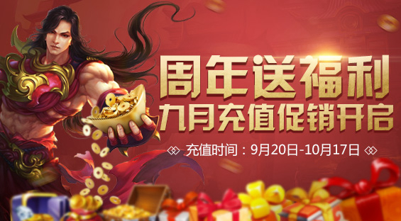周年送福利,九月充值消费开启,喜迎新服,九月充值将额外获得超级VIP卡、超级龙血丸等新服专属好礼,新服“谁与争锋”充值一定金额还可额外获得新服专属奖励雪猊坐骑。