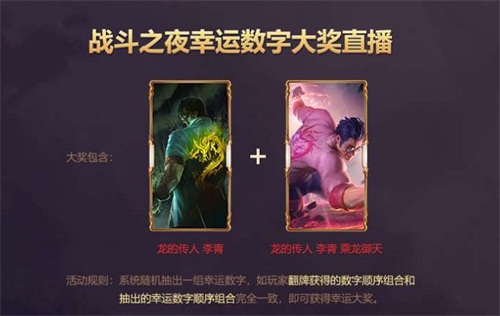 一年一度的《英雄联盟》战斗之夜马上就要来了,在9月22日当天,玩家在任意大区任意时间段登陆游戏并翻牌获得幸运数字“7”(100%必得),都能够100%获得永久免费皮肤,奖池内总计包含总计7000万份永久皮肤,700万份限定皮肤以及2018英雄联盟全球总决赛观赛之旅。除此之外,在9月22日将在英雄联盟官方电视台L–live 和斗鱼直播平台直播抽取幸运数字,公布获得国服首批龙的传人 李青-乘龙御天炫彩皮肤的幸运号码。