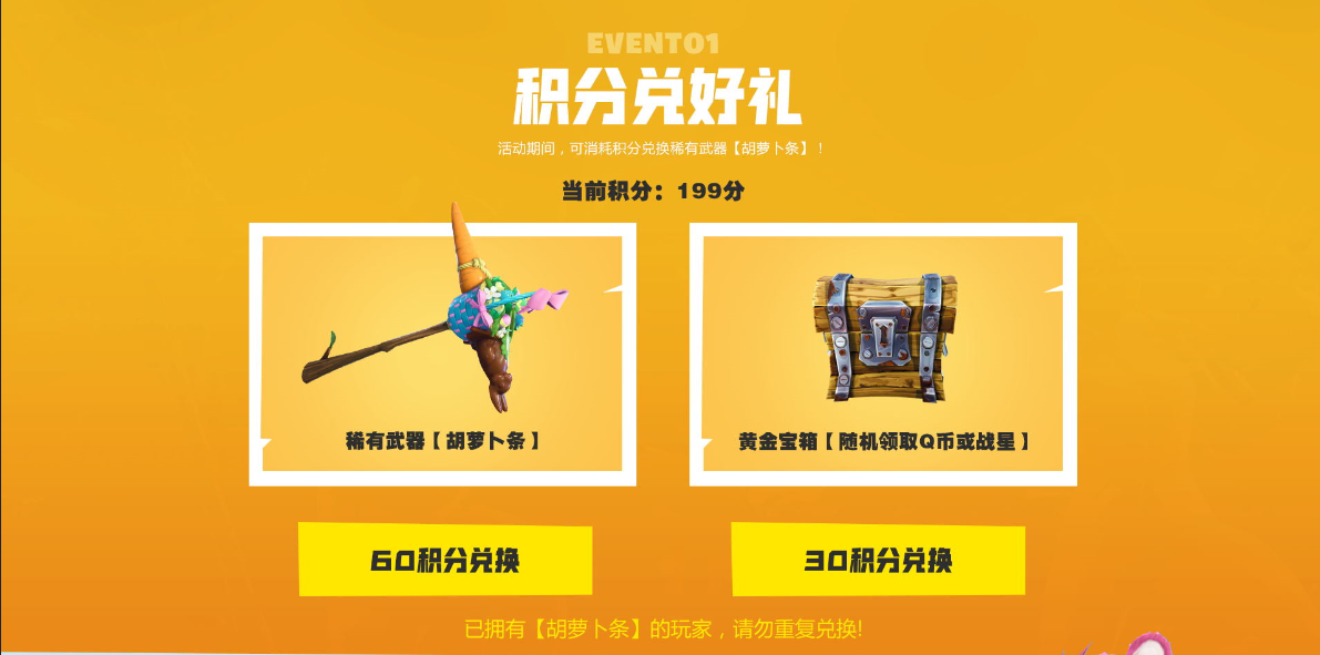 在活动期间,玩家可以通过积分兑换奖励,消耗60积分即可获得《堡垒之夜》稀有采集道具——胡萝卜条,消耗30积分将获得开启黄金宝箱的机会,随机奖励Q币或者战星,需要提醒玩家的是,如果你在之前的活动中已经兑换并拥有了“胡萝卜条”,那么这次请勿重复兑换!