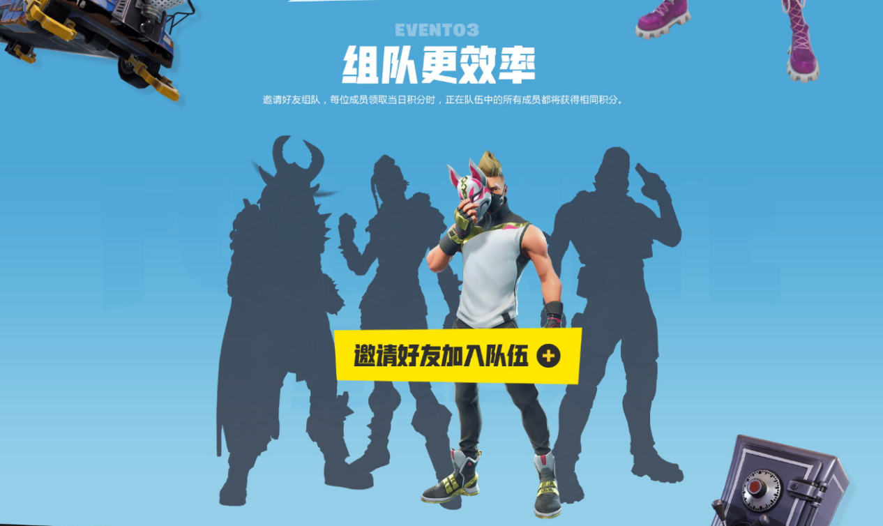 为了提升玩家获取积分的效率,更早的兑换本次中秋奖励。在活动期间,《堡垒之夜》加入组队功能,玩家可以邀请好友组队,当队内成员领取积分时,正在队伍中的所有成员都将获得相同积分,队友越多,积分越多,可以兑换的奖励也更加丰富。