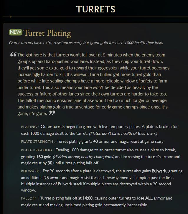 为了延缓外塔被推掉的速度,拳头在季前赛版本中不仅调低了一血塔的收益,而且还引入了“防御塔镀层”的全新概念。