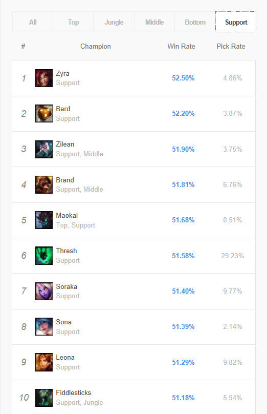 以上为韩服辅助胜率前十的榜单。大家知道在世界赛版本中硬辅是登场率最高的辅助,包括洛锤石女坦等。但是随着版本变更,软辅再次有抬头的趋势。前十的名单中只有3个硬辅。