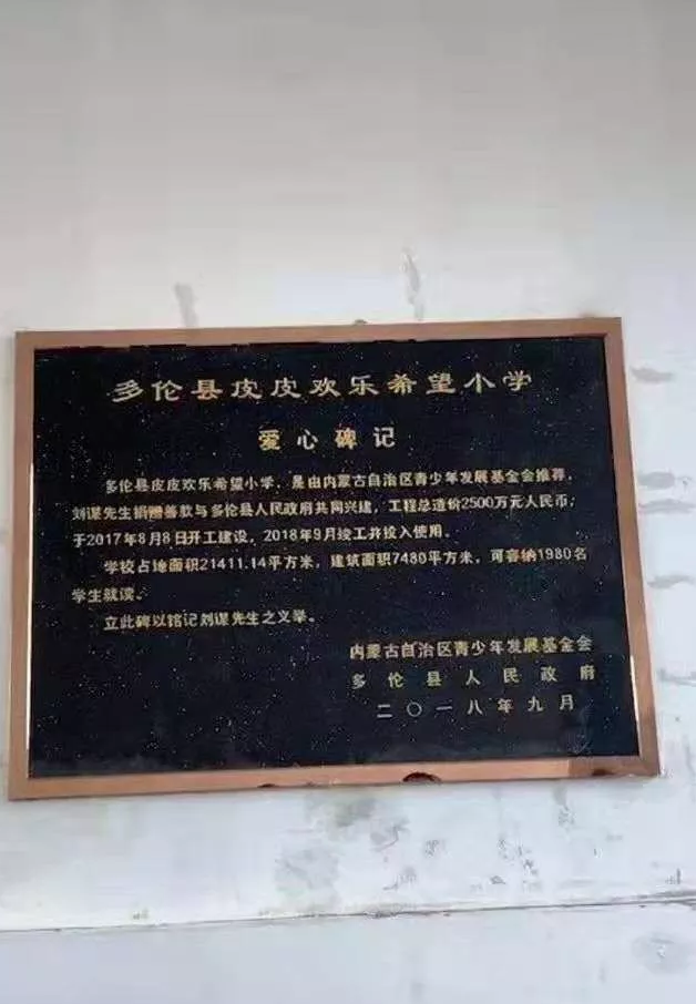 为此内蒙古多伦县县政府也为PDD建立了“爱心碑记”,来感谢PDD对于多伦多县希望小学的贡献。