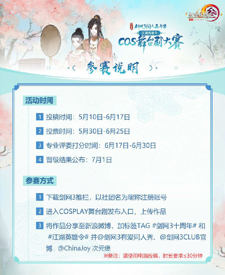 十年江湖路,一朝登台时!剑网3 携手ChinaJoy超级联赛举办的第三届“江湖英雄令”Cos舞台剧大赛,5月10日,报名通道开启!热爱舞台剧的你,快来报名参加吧!