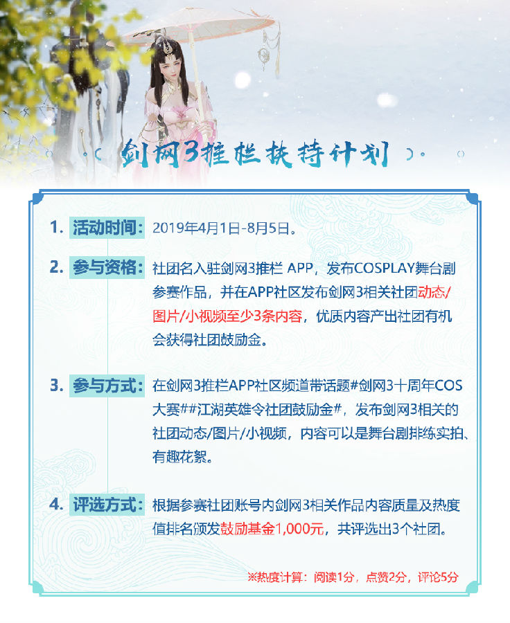 侠士们可以在2019.4.1-2019.8.5期间,以社团名入驻剑网3推栏APP,在剑网3推栏APP社区频道带话题#剑网3十周年COS大赛##江湖英雄令社团鼓励金#,发布剑网3相关的社团动态/图片/小视频至少3条(内容可以是舞台剧排练实拍、有趣花絮),优质内容产出社团有机会获得鼓励基金1,000元。