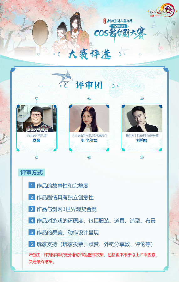 本届剑网3“江湖英雄令”Cos舞台剧大赛,有幸邀请到了西山居运营总监玖隆、西山居&剑网3品牌拓展总监红尘秘意、舞台剧《曲云传》执行导演刘柏辰,各位大咖将一同参与到大赛的评选当中,与侠士们一同见证大赛冠军的诞生!