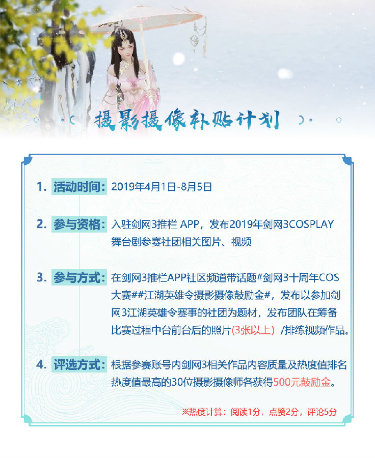 参赛的侠士们须入驻剑网3推栏APP,于2019.4.1-2019.8.5期间,在剑网3推栏APP社区频道带话题#剑网3十周年COS大赛##江湖英雄令摄影摄像鼓励金#发布2019年剑网3Cosplay舞台剧参赛社团相关图片、视频(3条以上),剑网3相关作品内容质量及热度值排名最高的30位摄影摄像师各获得500元鼓励金。