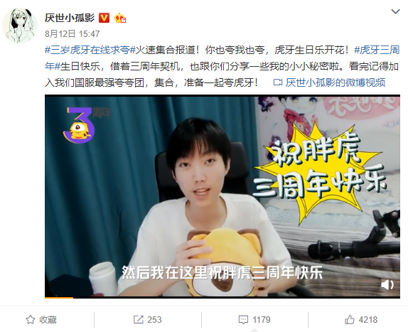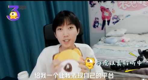 在虎牙三周年之际,孤影给虎牙献上了爱的鼓励:“感谢虎牙给我一个让我表现自己的平台,非常开心,然后希望虎牙以后越做越好。能陪伴我一起走下去。”