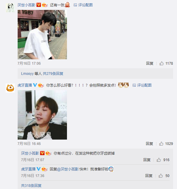 孤影和虎牙非常亲密,因此虎牙也常常跟他开玩笑,比如在孤影的超帅写真下“发黑照”,孤影立即向虎牙发出“拔牙警告”。