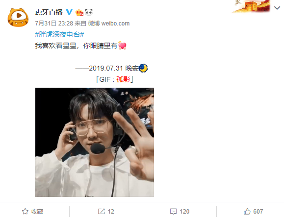 先说颜值,他的颜值可是得到虎牙官方承认的。虎牙直播的官微发布了孤影GIF,配文“我喜欢看星星,你眼里有心心。”肯定了他的颜值。