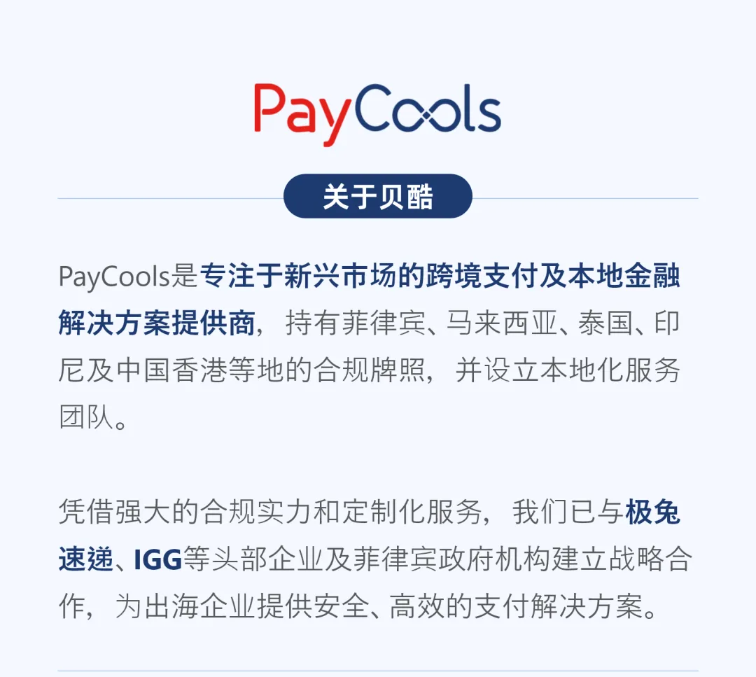 PayCools 已获得菲律宾、泰国、马来西亚、印尼及中国香港等多个重点市场的政府监管机构颁发的支付牌照,具备合规开展跨境支付及本地化金融服务的能力。收付款渠道涵盖各新兴市场的信用卡、电子钱包、本地银行等。