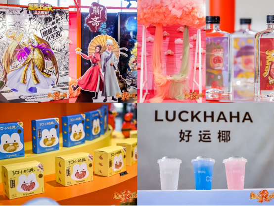 还未进主会场,嘉宾们便手捧“好运椰”椰子水,在体验区开启了沉浸式漫游,这里,有电影《有朵云像你》《聊斋:兰若寺》的浪漫和奇幻,打卡完游戏《圣斗士星矢:正义传说》装置,转过头,琳琅的潮玩墙又映入眼帘。虚拟男团Vexel前,挤满了体验互动的“游客”,自研零食“三口小时光”的货架则常补常空......