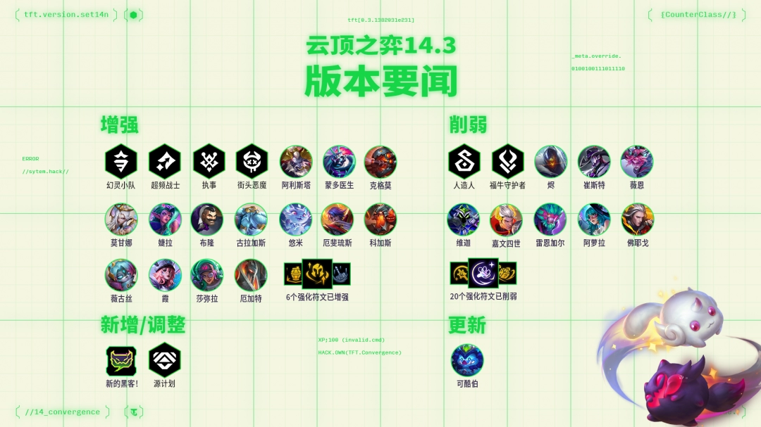 就在最近云顶之弈官方放出了对于14.6版本的更新内容,这次更新有许多英雄进行了调整,【强音争霸】选手、【6周年时光机】乘客和【赛博之城】居民齐聚一堂!从回归赛季到【发条鸟的试炼】,那么下面就给大家带来云顶之弈14.6阵容推荐。